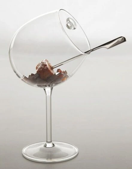 Het 100% Chef glas op voet is gemaakt van borosilicaatglas. Het is vormgegeven als een bourgogneglas waarbij de kelk met een van de zijwanden op de steel is gemonteerd. Gebruik het glas om kleine gerechten in te serveren. In het kleine oor aan de zijkant kan je de bijvoorbeeld een lepeltje of vorkje bewaren.
