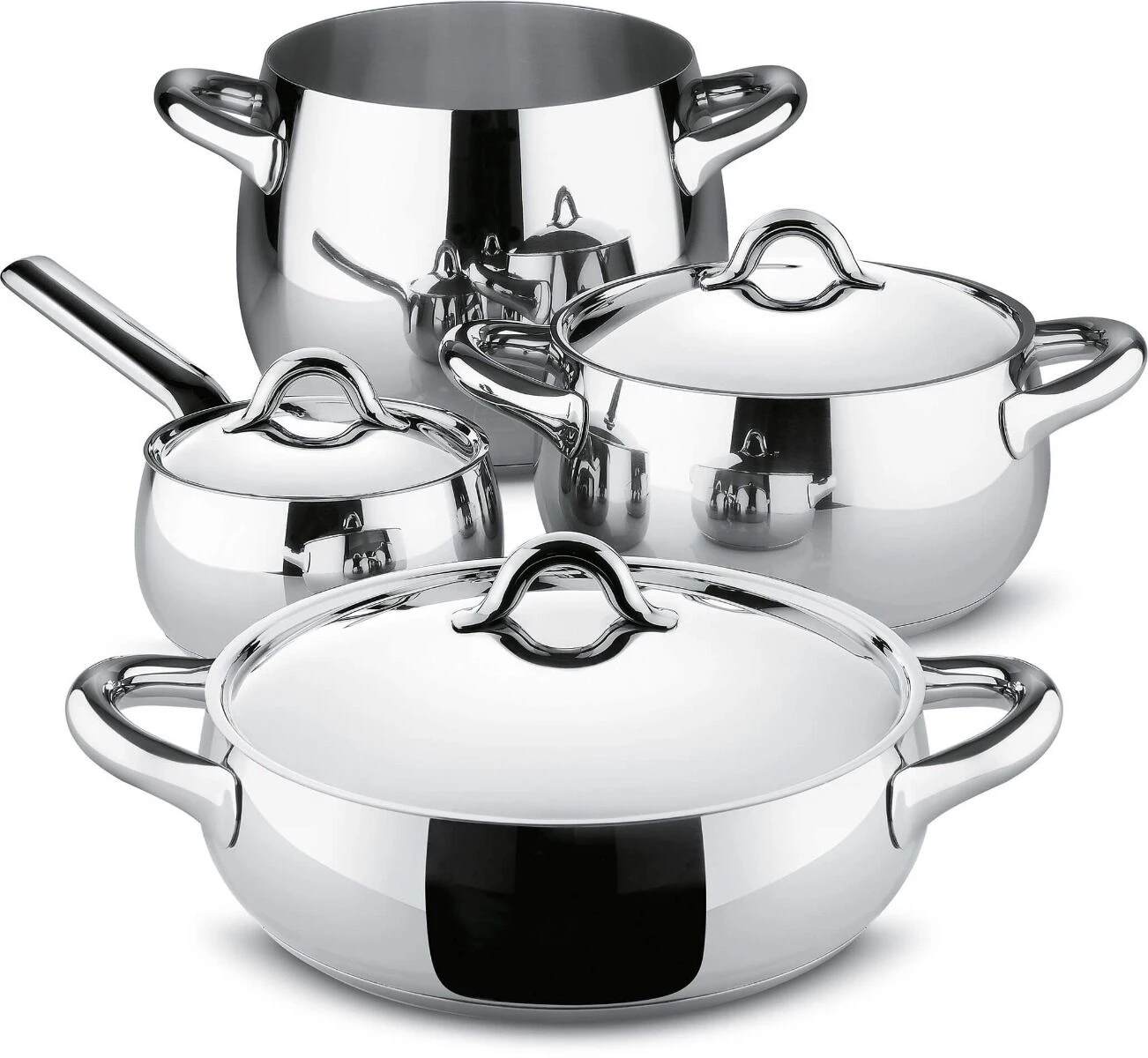 De Alessi Mami pannenset is vervaardigd uit rvs, heeft een aluminium kern in de bodem en bestaat uit 7 onderdelen. Hierdoor is er voor vrijwel alle gerechten een geschikte optie beschikbaar. De set is ontworpen door Stefano Giovannoni.