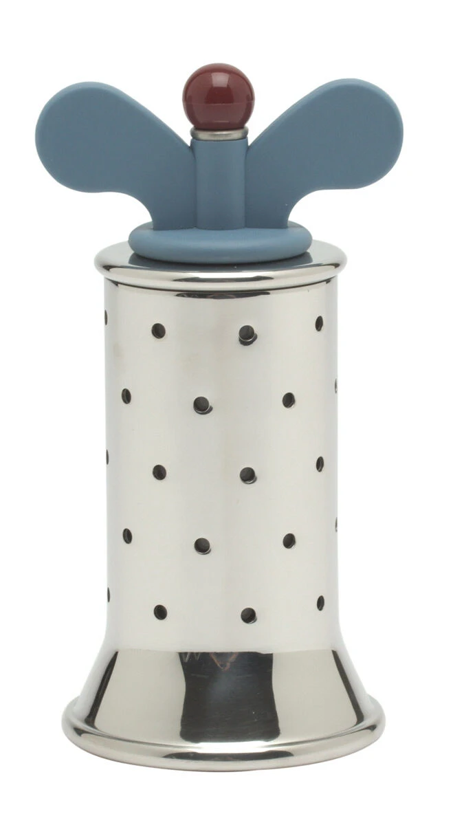 De door Michael Graves ontworpen pepermolen van Alessi is gemaakt van roestvrij staal en heeft een blauwe kunststof vleugel. De pepermolen is 13,2 cm hoog en heeft een diameter van 5 cm. Het maalwerk van de pepermolen is gefabriceerd door Peugeot.
