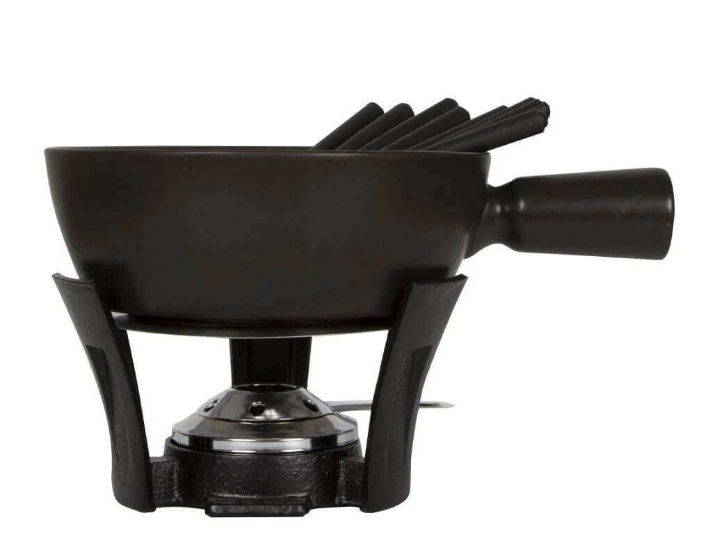 Met de Boska Nero kaasfondueset maak je kaasfondue voor een groot gezelschap. De zwarte keramieken fonduepan heeft een inhoud van 2,2 liter, dit staat gelijk aan 1,5 kilo kaasfondue. Ook is de pan vuurvast en kan daardoor worden gebruikt om de kaasfondue op te warmen op het gasfornuis. De pan is vaatwasmachinebestendig. De kaasfondueset bevat ook 8 stevige vorken van roestvrijstaal met eikenhouten handvat en een gietijzeren onderstel. De kaasfondue blijft warm door de fonduebrander in het onderstel, geschikt voor vloeibare brandstof en brandgel.