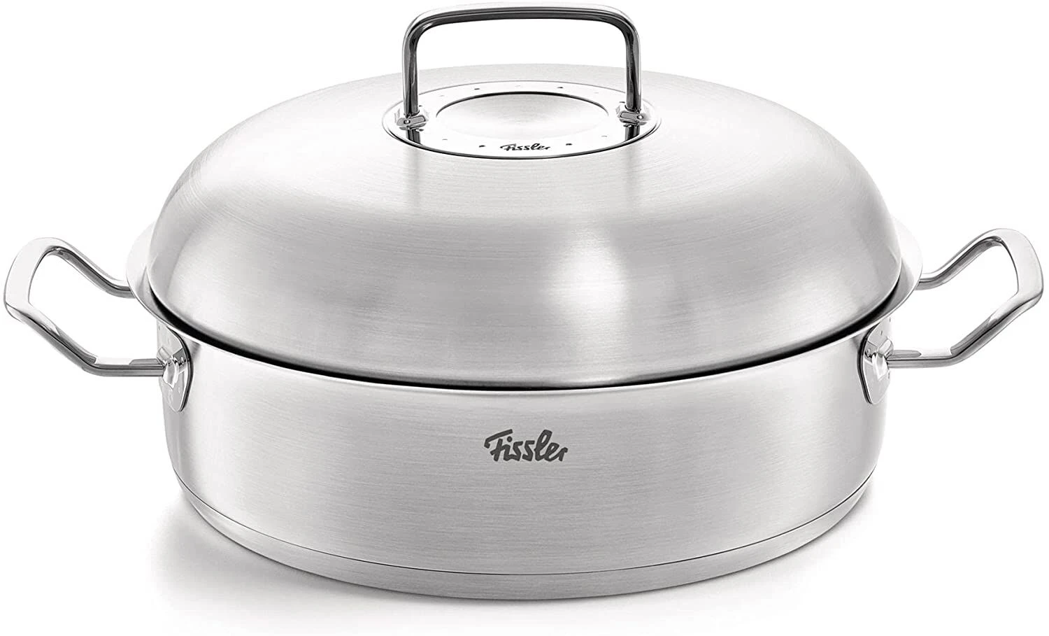 De pannen van de Fissler Original Profi Collection zijn gemaakt van hoogwaardig roestvrij staal. Ze zijn voorzien van een CookStarbodem, een ingekapselde aluminium kern, voor een snelle en gelijkmatige warmtespreiding. Dit maakt de pannen tevens geschikt voor gas, elektrisch, keramisch, halogeen en inductiefornuizen. De pannen zijn tevens geschikt voor gebruik in de oven tot 230°C. De nauwkeurige sluitende deksels houden warmte en vocht in de pan, zodat uw etenswaren niet uitdrogen en u met minder vocht en energie kookt. Door de concave vorm van de deksel druppelt stoom terug in de pan.