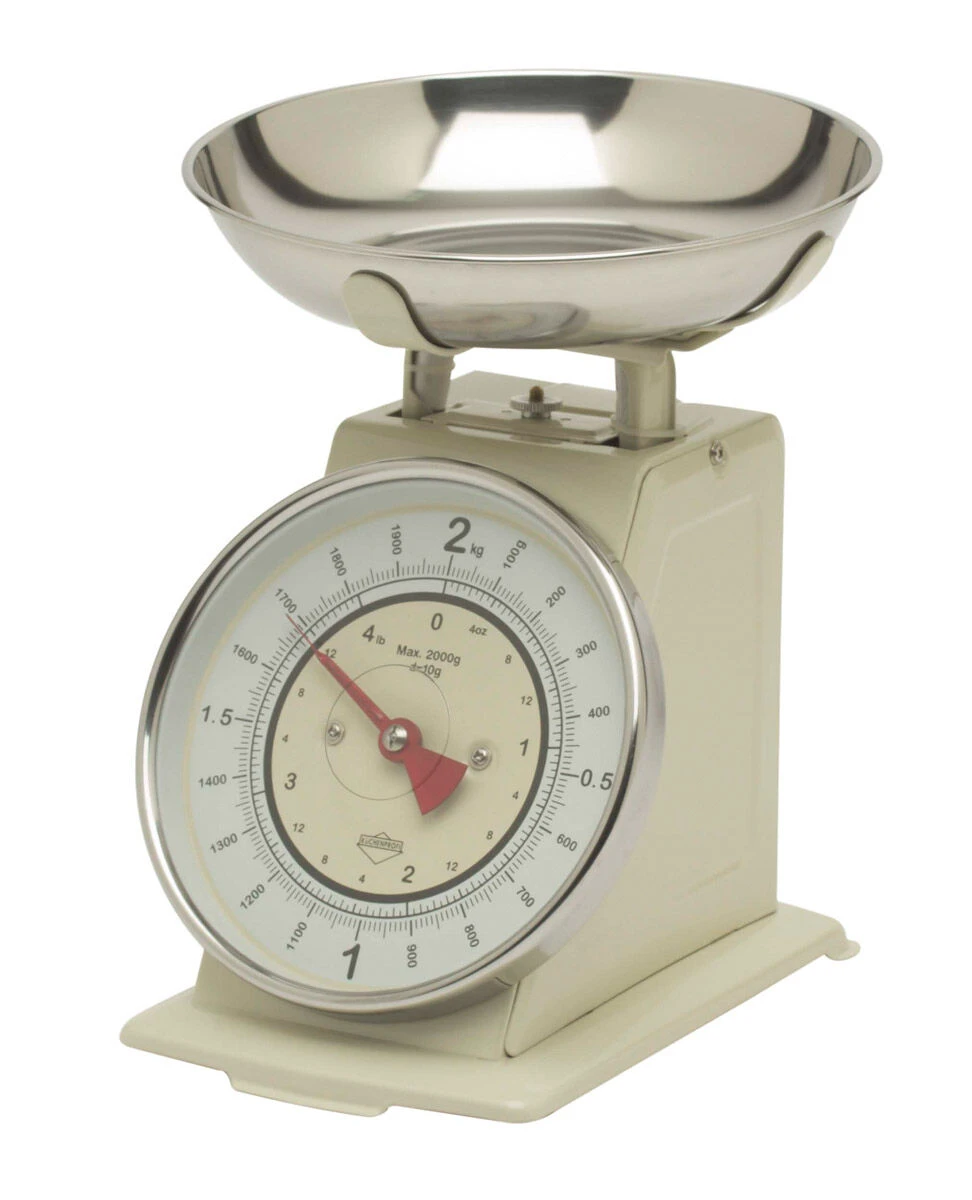 De analoge weegschaal van Küchenprofi is gemaakt van crèmekleurig roestvrij staal en heeft een afneembare weegkom. De weegschaal weegt tot maximaal 2 kilogram, in stappen van 10 gram. De weegschaal is 21 x 21 x 24 cm (l x b x h).