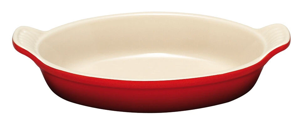 De ovale Le Creuset ovenschaal is gemaakt van kersrood geglazuurd aardewerk en is 28 cm lang. De inhoud bedraagt 1,6 liter. Bereid en serveer in de ovenschaal gerechten zoals lasagne, gebraden gevogelte en aardappelgratin.