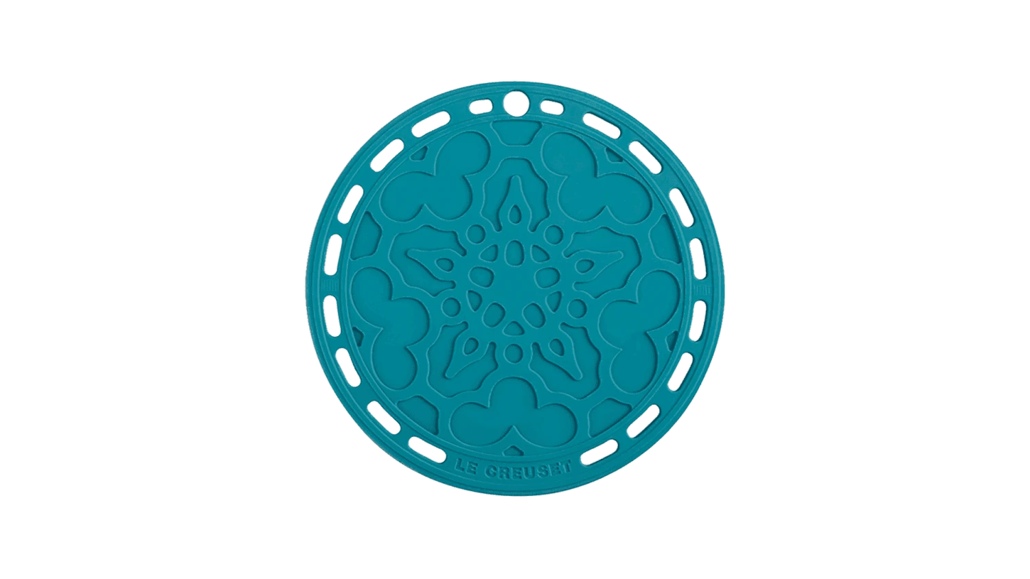 De Le Creuset pannenonderzetter is gemaakt van blauwe silicone en heeft een diameter van 20 cm. Gebruik de Caribbean Blue, flexibele lap als onderzetter of als pannenlap.