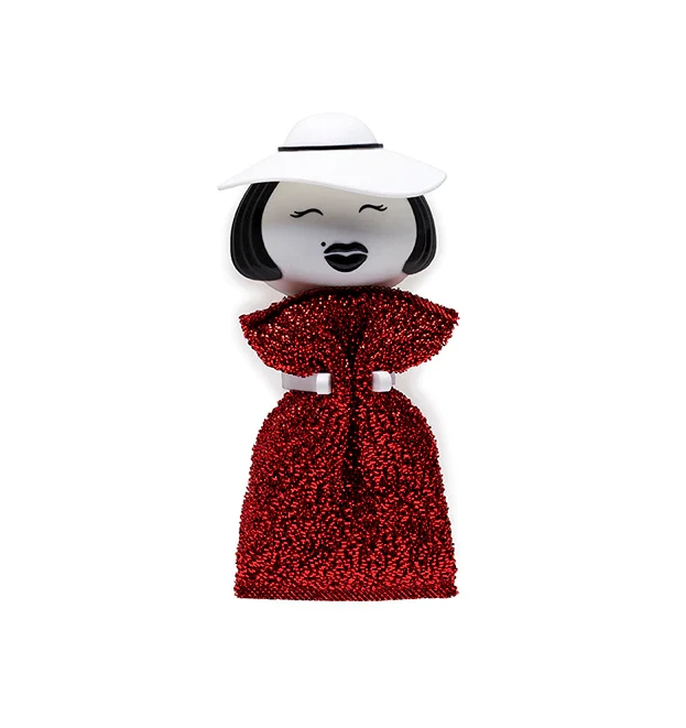 De Mrs. Sponge schuursponshouder is gemaakt van wit en zwart kunststof. Mrs. Sponge is vormgegeven als een dame met een hoedje op, wanneer er een schuurspons in de clip onder haar gezicht hangt lijkt het of Mrs. Sponge een rood jurkje draagt. De schuursponshouder is 9,7 cm lang, 8,3 cm breed en 5 cm diep.