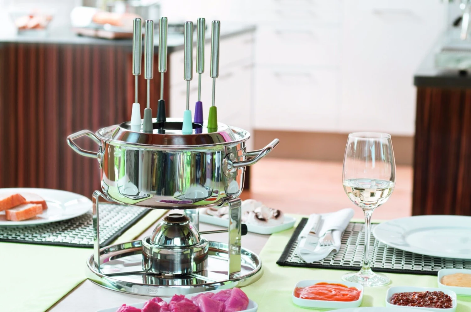 De verschillende onderdelen van deze fondueset zijn wisselen hoogglanzend en gematteerd, waardoor de set een eigentijdse uitstraling krijgt. De zes verschillende vorken zijn voorzien van een gekleurde kunststoffen omhulling, zodat iedereen de eigen vork gemakkelijk kan herkennen.
