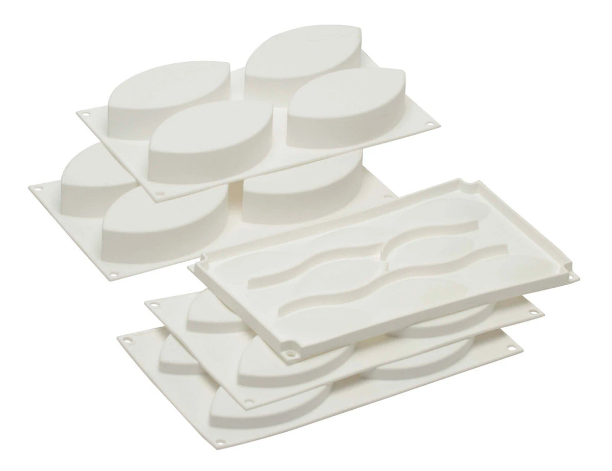 De Silikomart Professional bakvormenset bestaat uit 5 witte siliconen bakvormen voor het vormen van ovalen. Met de set bouwt u eenvoudig taartjes of desserts op in verschillende lagen.