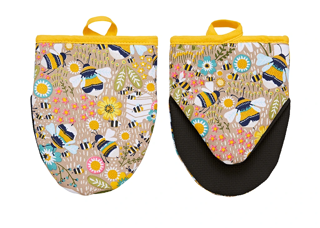 De Double Micro ovenwanten set is perfect voor het hanteren van hete potten en schalen tot 100 graden Celsius. De handpalmen van neopreen beschermen tegen stoom en heet water en helpen uw vingers veilig te houden bij het hanteren van uw nieuwste culinaire meesterwerk. Dit vrolijke ontwerp van Bee Keeper is een lust voor het oog! Het doet denken aan zonnige dag waarop de bijen rondvliegen.
