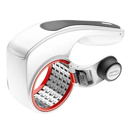 De Zyliss All kaasmolen is vervaardigd uit wit kunststof met een roestvrijstalen, geëtste rasp. Voor het raspen van harde kazen boven de pasta of salade. De kaasmolen wordt geleverd met twee verschillende trommelraspen en is voorzien van een veilige anti-slipcoating op de hendels. Zowel geschikt voor links- als rechtshandige gebruikers. Doe een stuk kaas in de vulopening en druk deze aan met de veilige duwer.